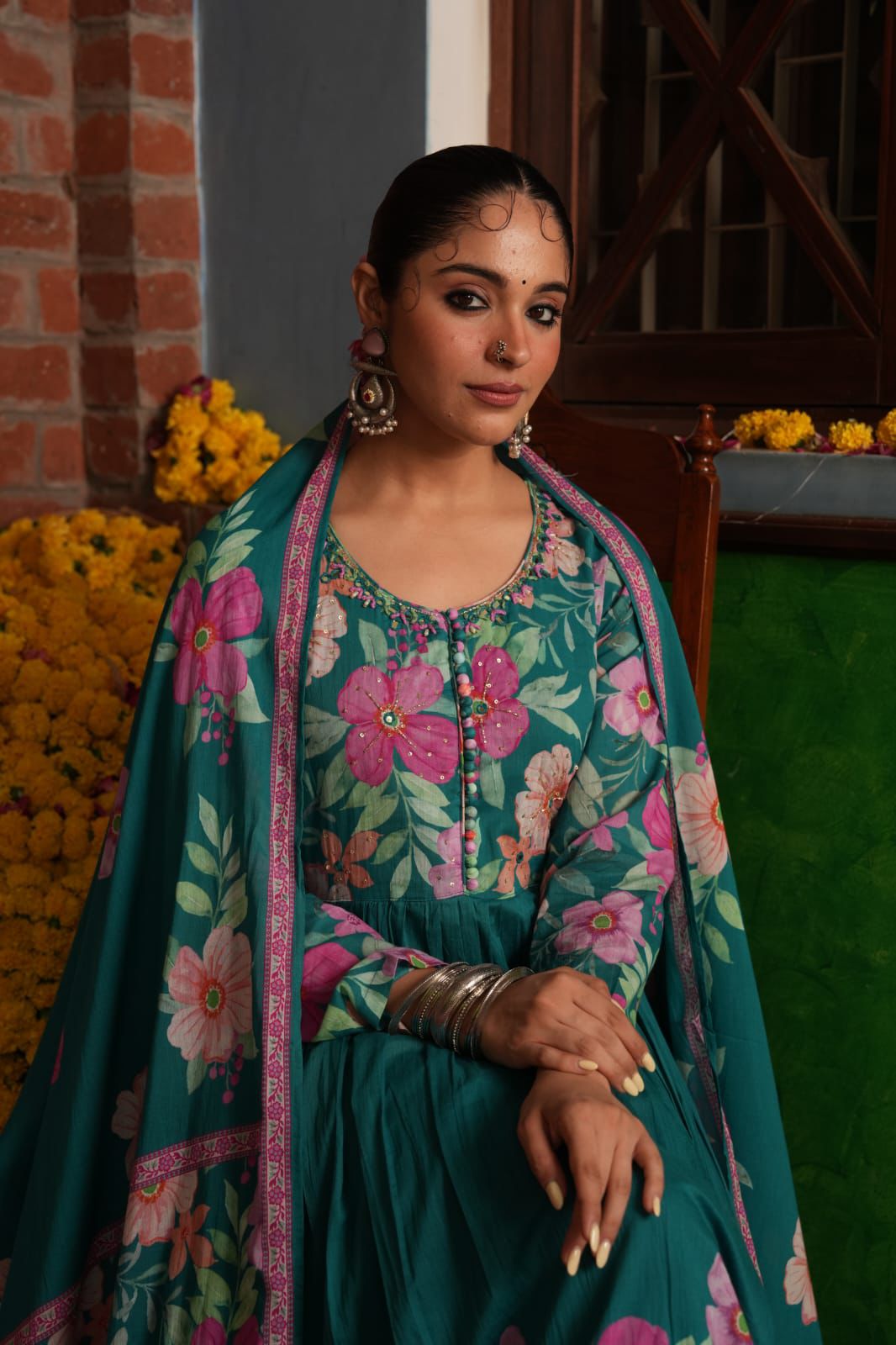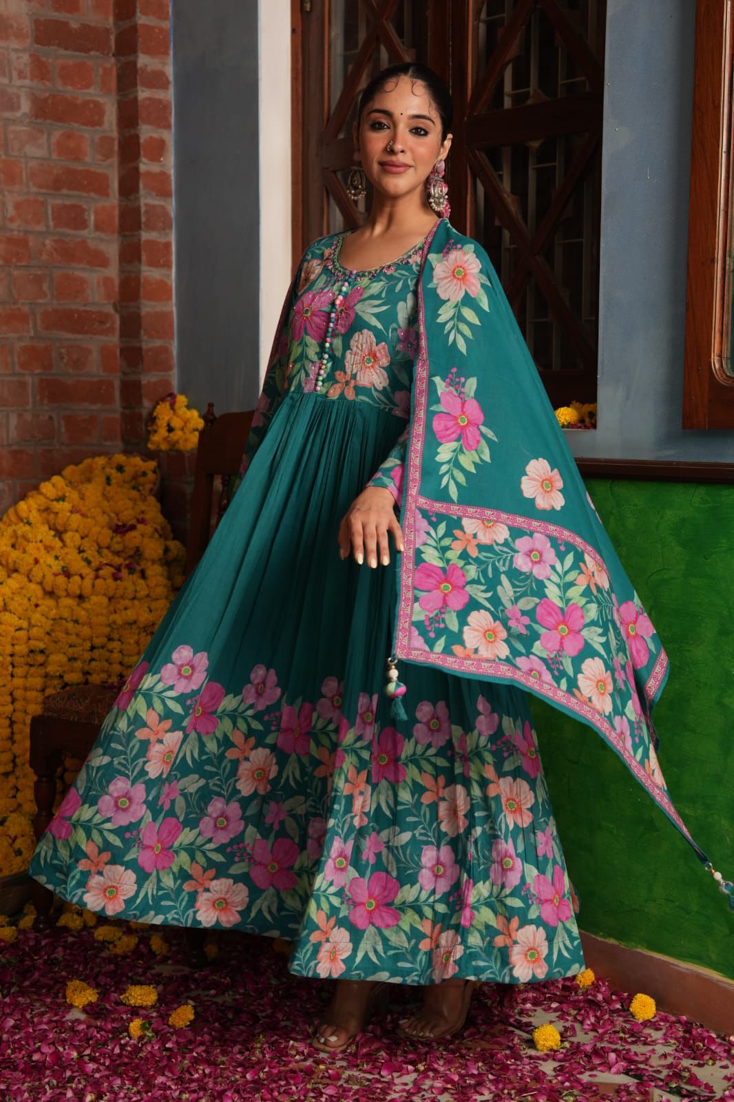 The full-flared Anarkali gown captivates with its rich teal green base, serving as a breathtaking canvas for an abundance of vibrant, painterly floral prints in captivating shades of pink, orange, and green. These lush motifs adorn the entire gown and its voluminous skirt, creating a dynamic and artistic visual narrative. The elegant round neckline features subtle button detailing and delicate embroidery, adding a touch of refined artistry. It is beautifully complemented by a matching lightweight cotton dupatta with coordinating floral prints and borders, completing a look that resonates with joyful grandeur.