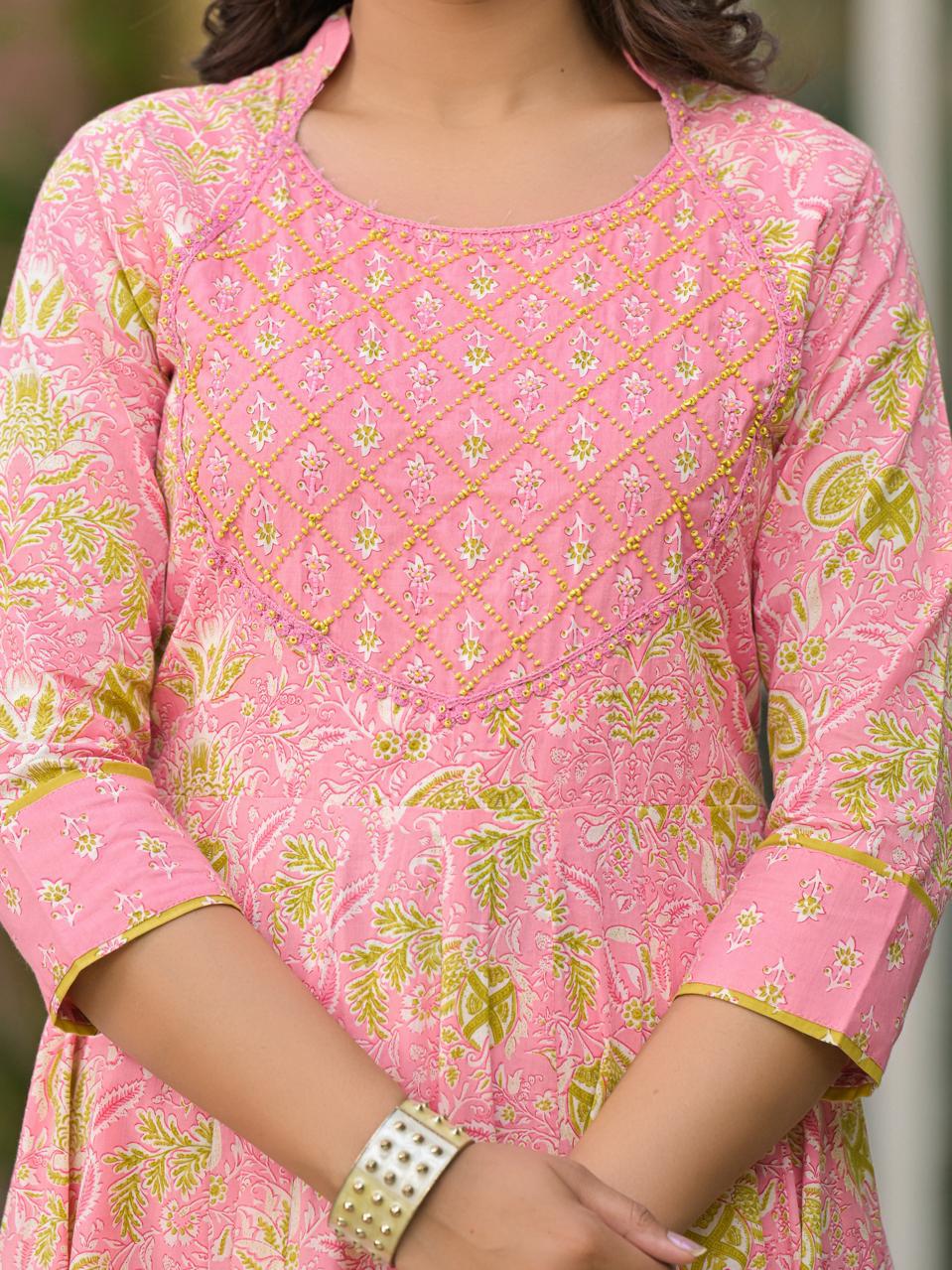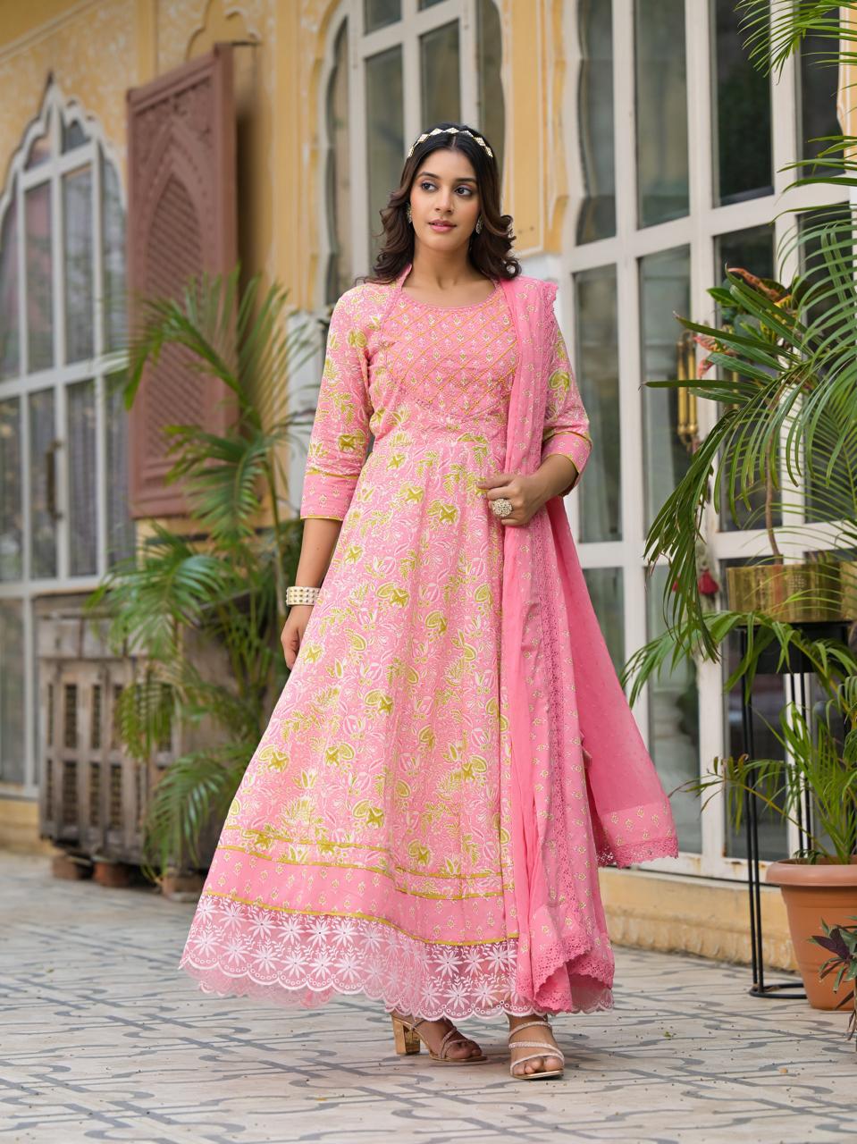 Make an entrance with Gulnar – a radiant anarkali in soft pink, blooming with gold florals and scalloped lace hem. Perfect for twirls, toasts, and treasured occasions. Comes with a matching dupatta to complete the look.