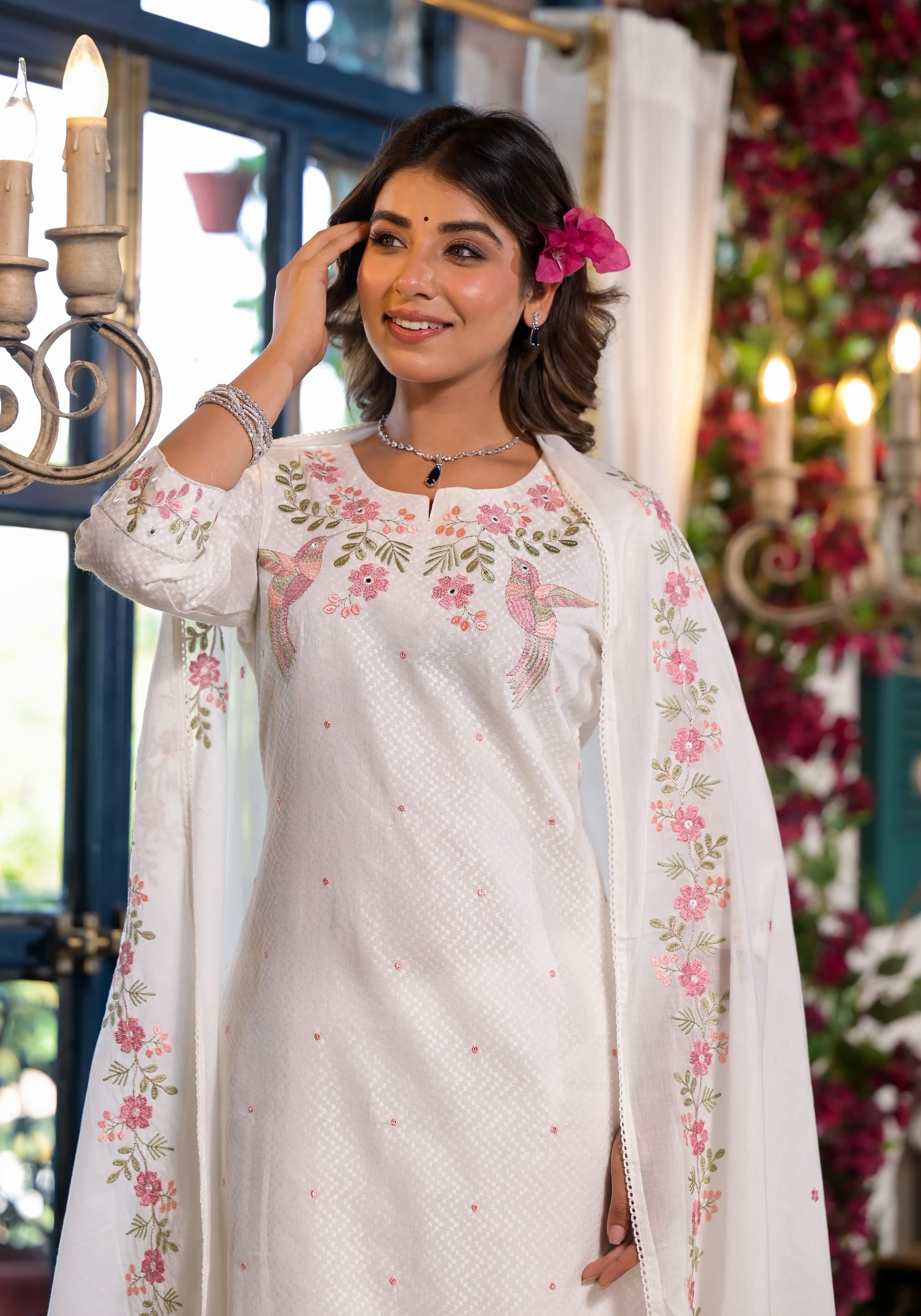 The straight-cut kurta is a canvas for intricate floral embroidery, showcasing charming pink and green blossoms alongside delicate bird motifs, artfully stitched across the yoke, elegant V-slit neckline, and three-quarter sleeves. These detailed threadwork patterns create a captivating visual story, reminiscent of a serene spring garden. Paired with comfortable straight-cut cotton pants featuring a subtle embroidered hem and a matching lightweight white cotton dupatta adorned with complementary floral borders, this ensemble creates a cohesive look that moves with poetic fluidity.