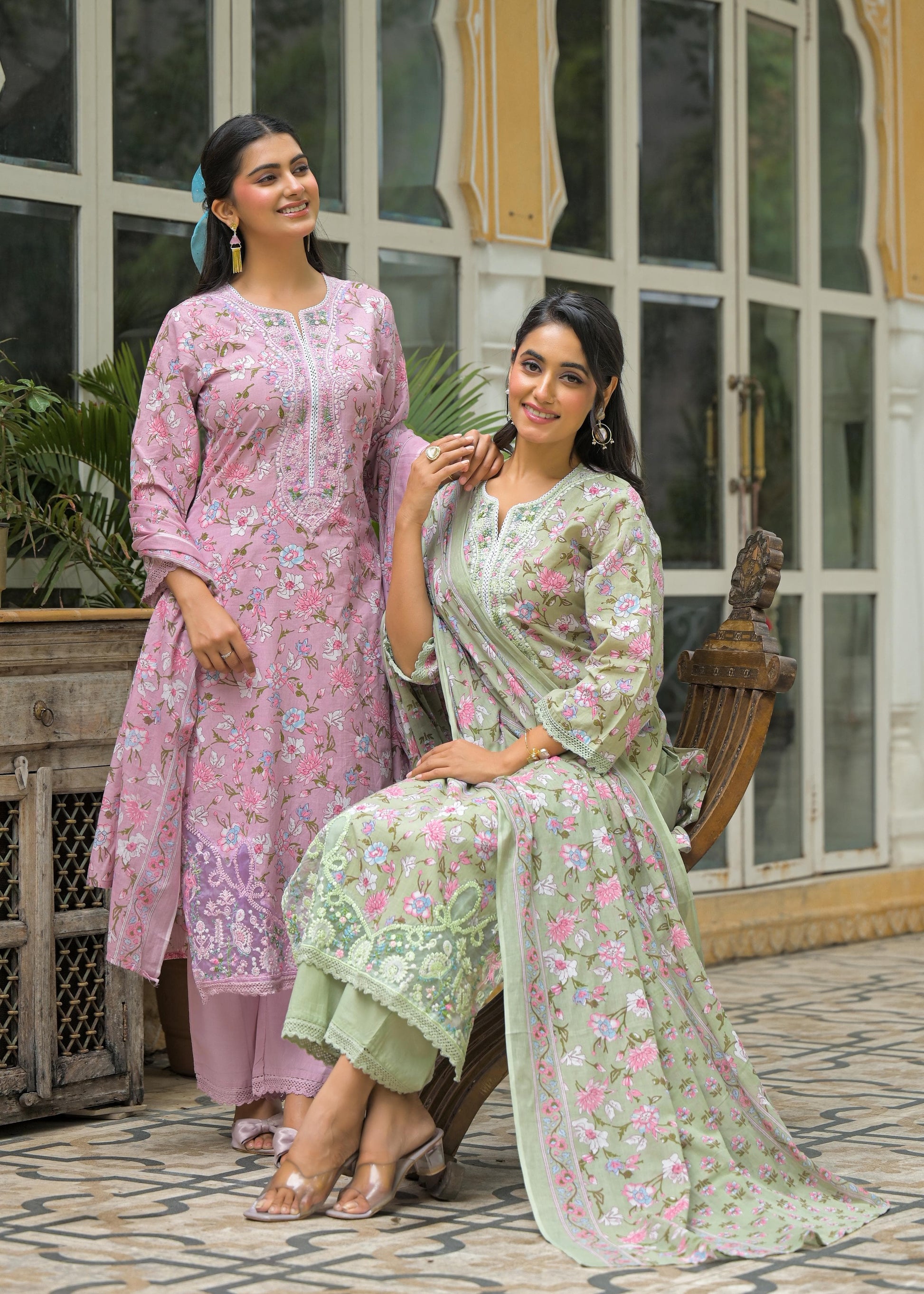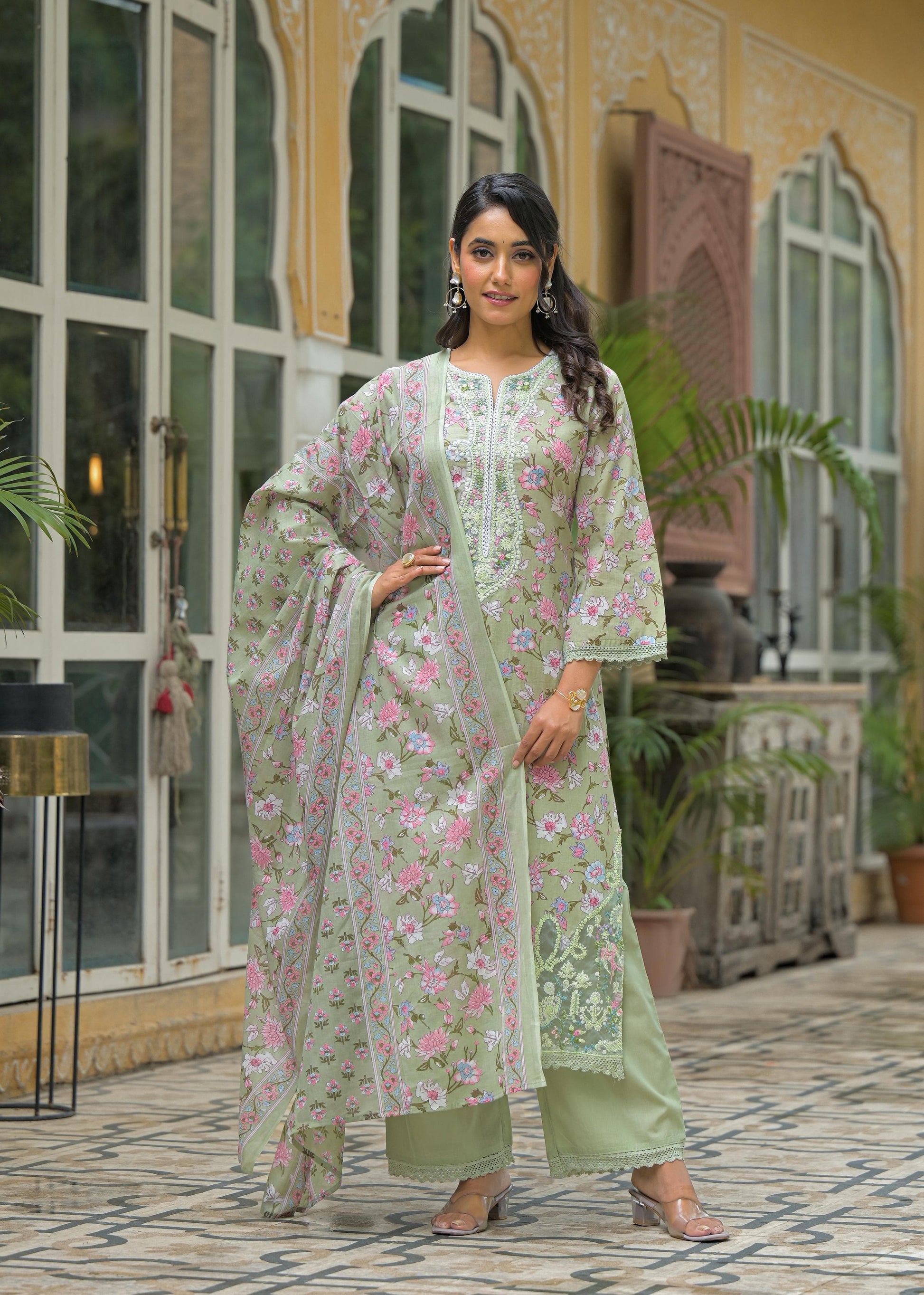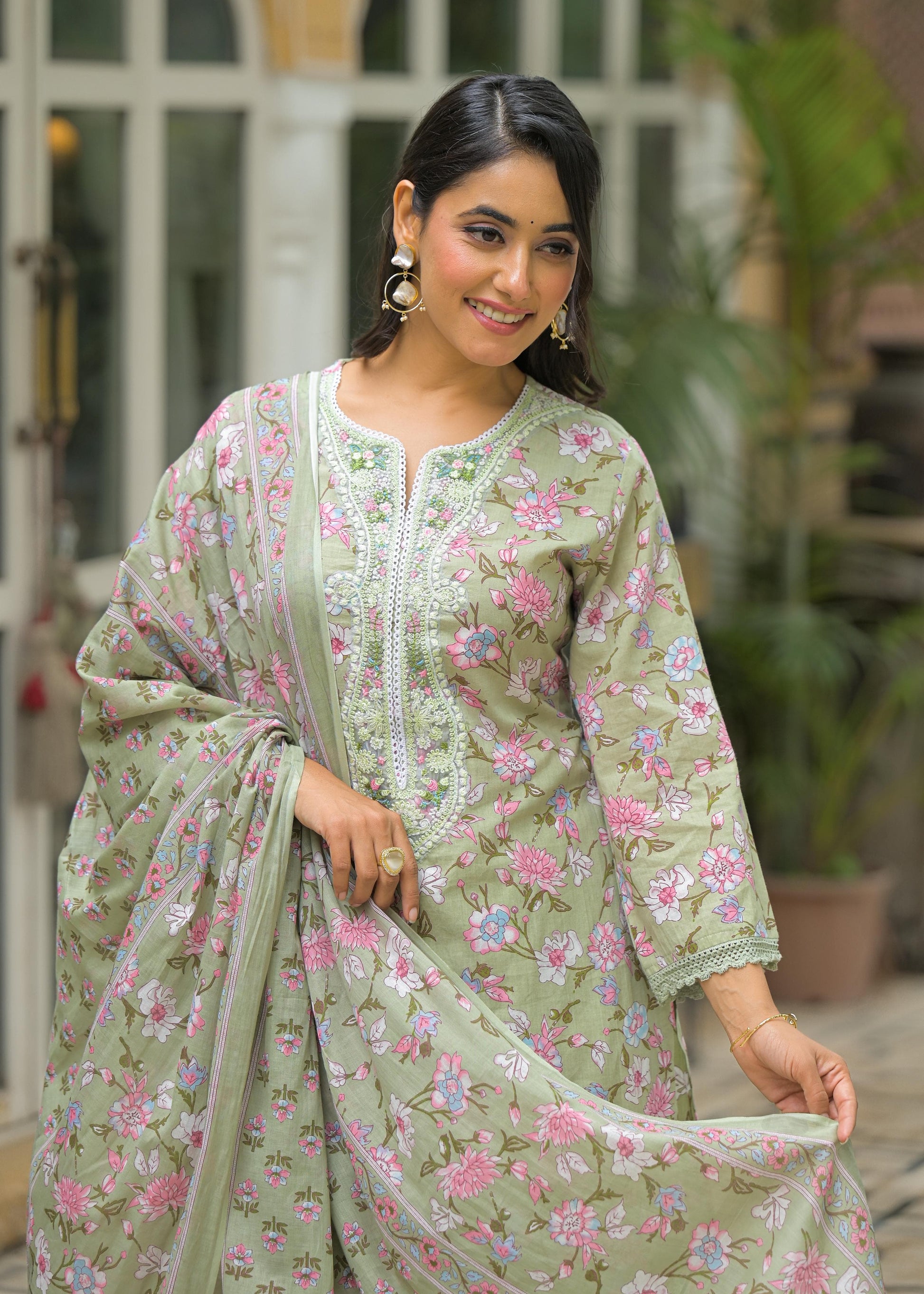 Let elegance bloom with Mehr – a sage green suit set designed for women who embrace subtle charm with timeless grace. Crafted in soft cotton, this floral embroidered ensemble is adorned with intricate threadwork across the kurta, delicately scalloped lace on the sleeves and hem, and paired with plazzo-fit pants finished with lace detailing. The digitally printed dupatta adds a layer of softness with its pastel pink floral accents, making it perfect for festive gatherings, elegant daytime events, or intimate celebrations.