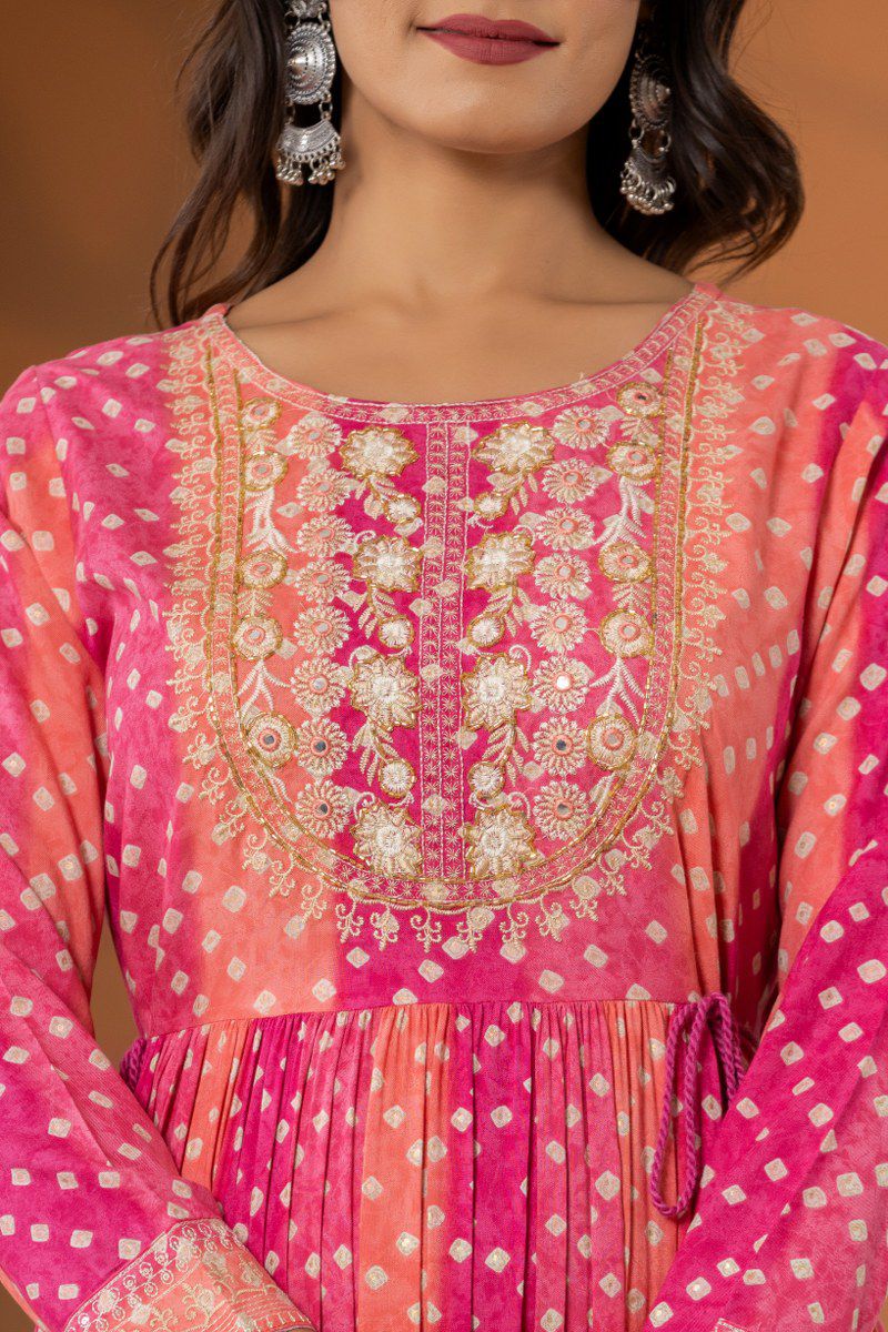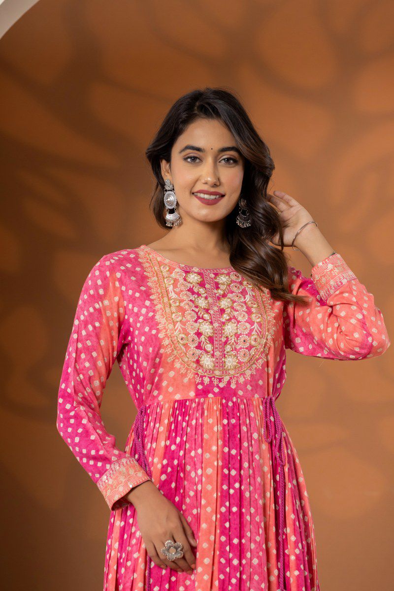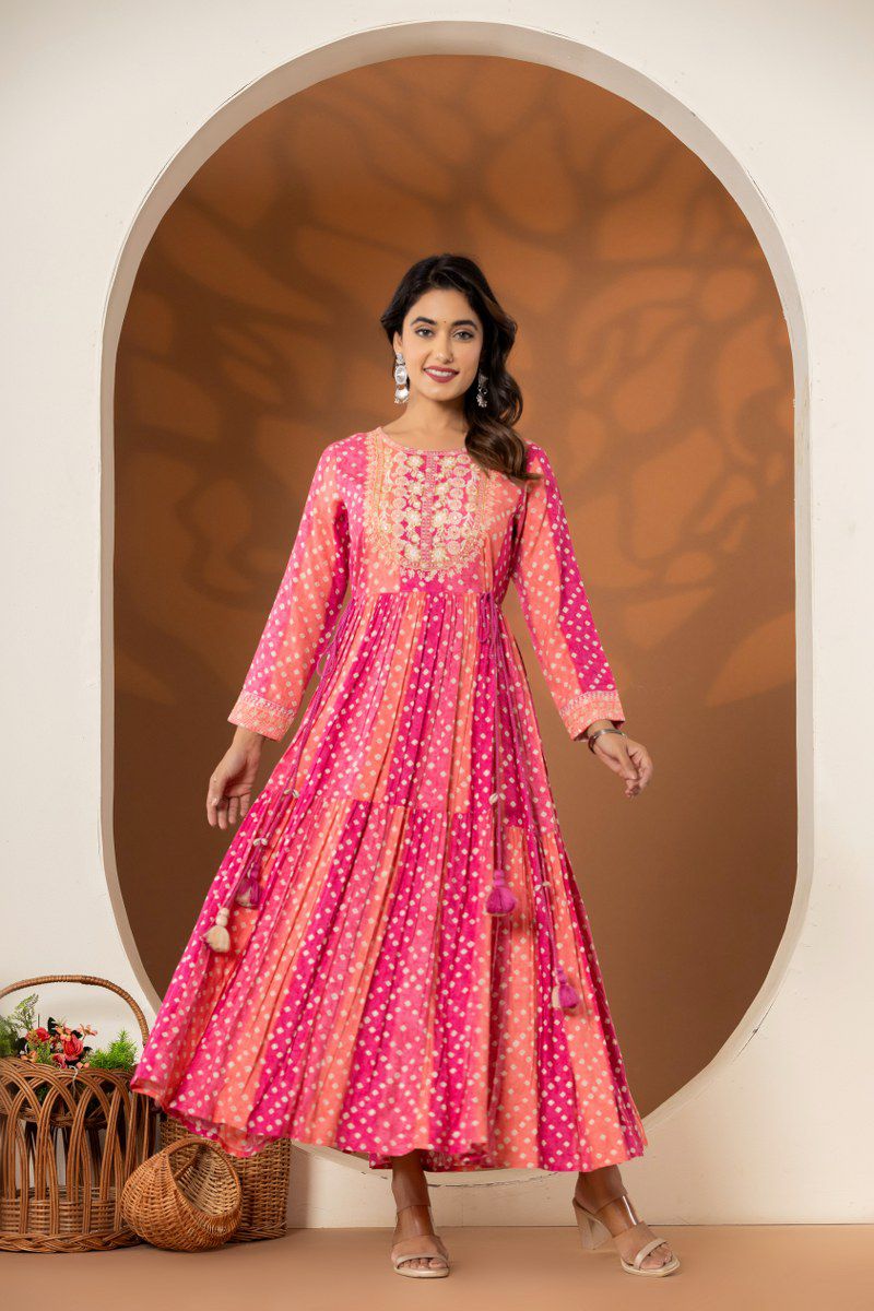 Rangrez – Pink Bandhej Printed One Piece Dress in German Rayon with Tassel Details