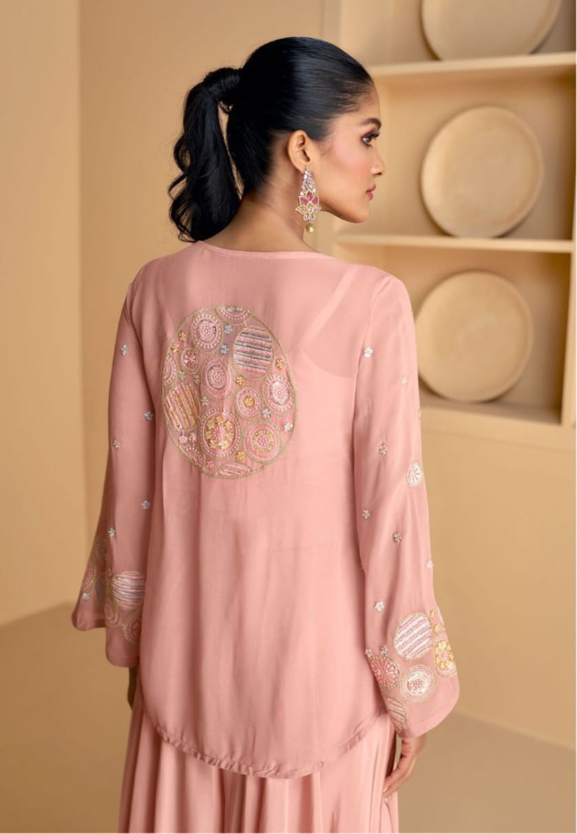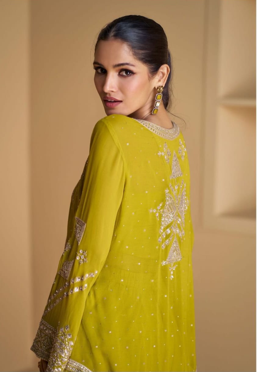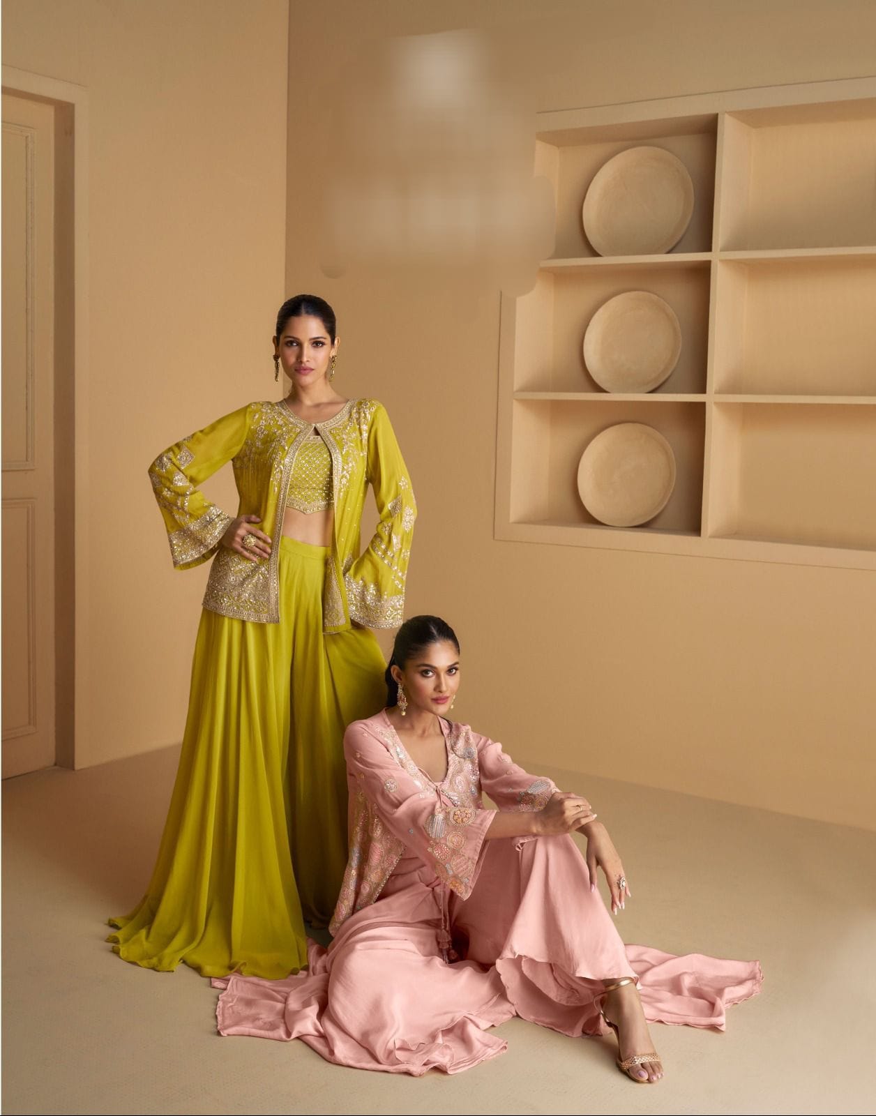 This designer georgette dress set features a finely embroidered crop top, a flowy sharara, and a luxe bell-sleeve shrug with subtle embroidery. Available in two stunning shades — bold neon for a striking presence and soft peach for understated elegance — it’s crafted to stand out without shouting.
