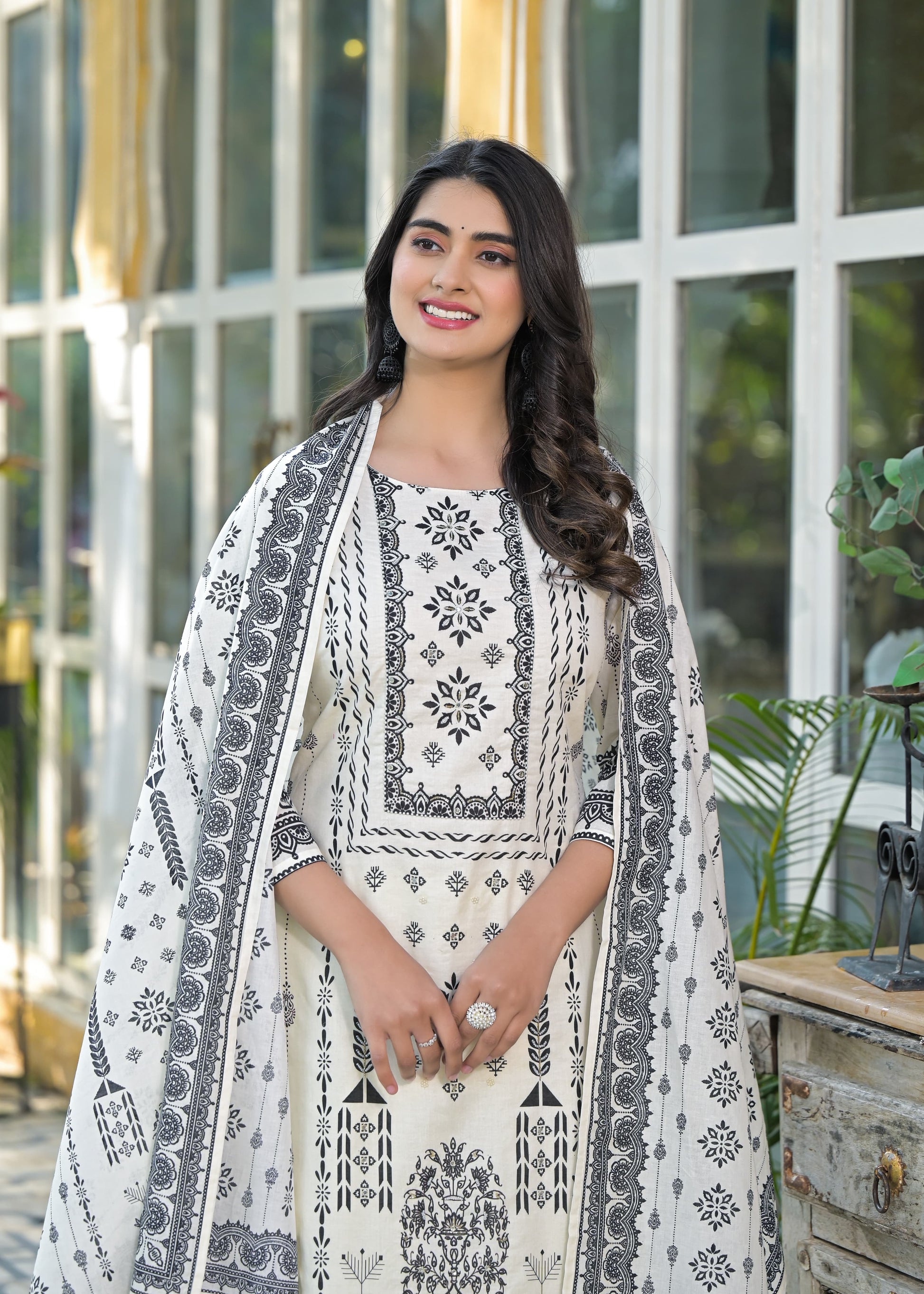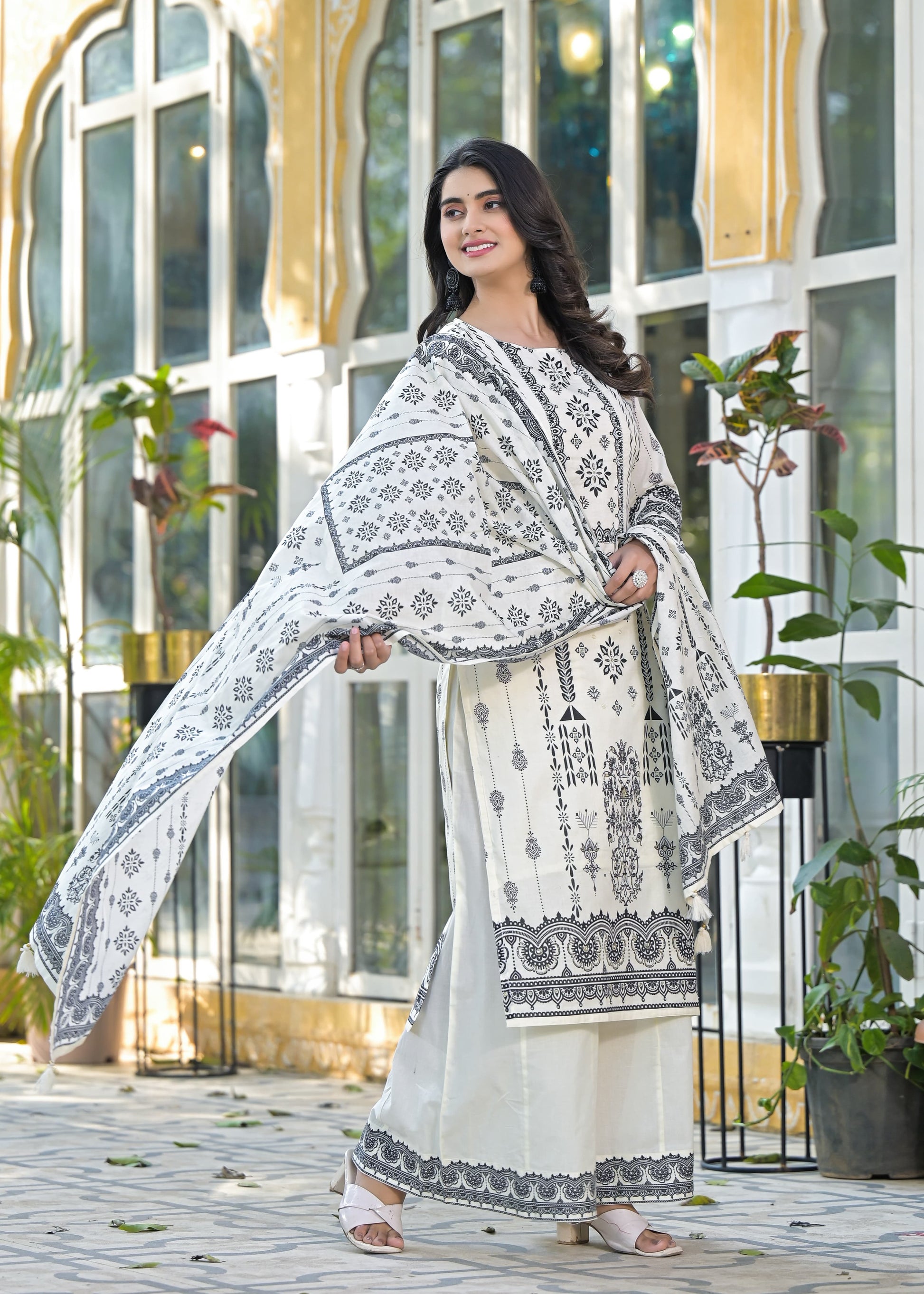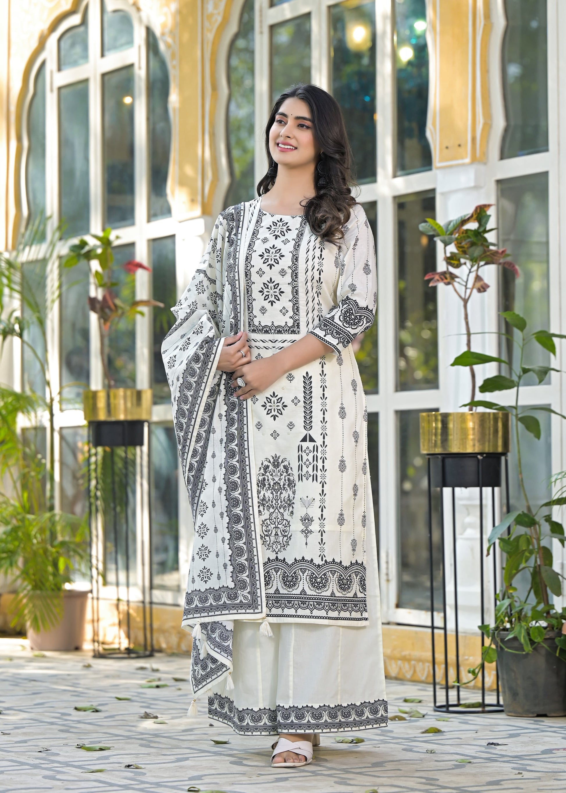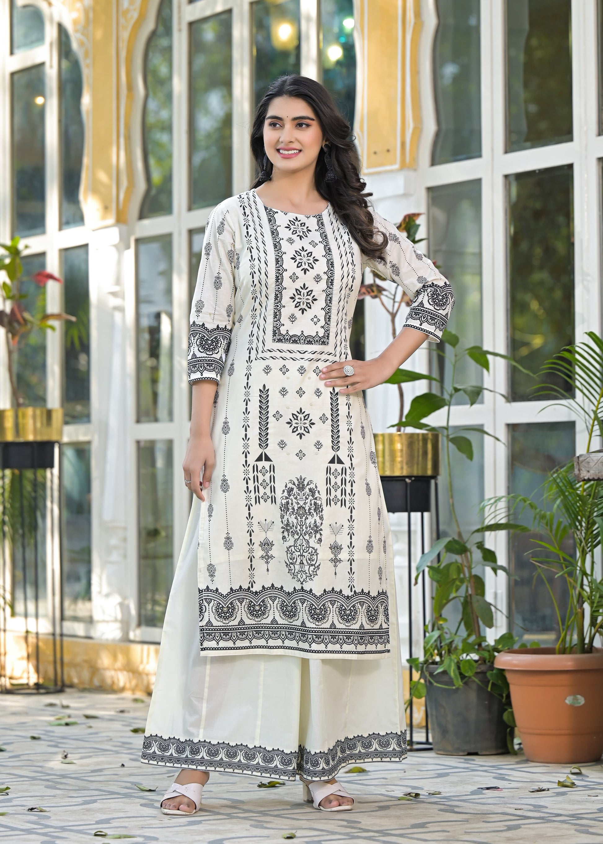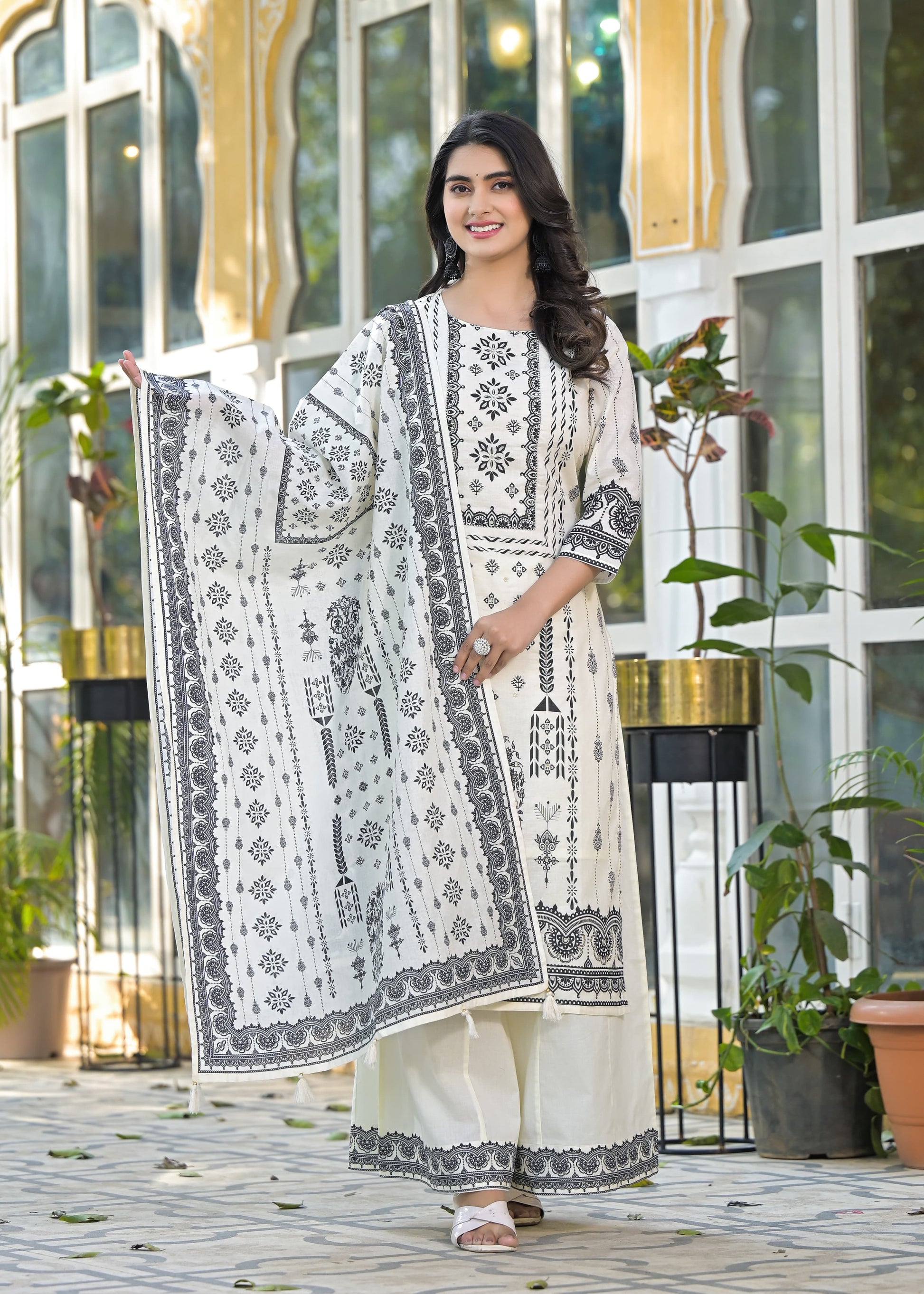 The crisp off-white kurta unfolds a mesmerizing narrative of intricate black block prints. Bold geometric motifs and classic patterns dance across the straight silhouette, creating a visually compelling monochrome symphony. This graphic artistry extends seamlessly to the generous flare of the wide-leg palazzo pants, ensuring a dramatic yet fluid drape with every step. Completing this distinguished look is a matching lightweight cotton dupatta, echoing the captivating black and white prints in perfect harmony.