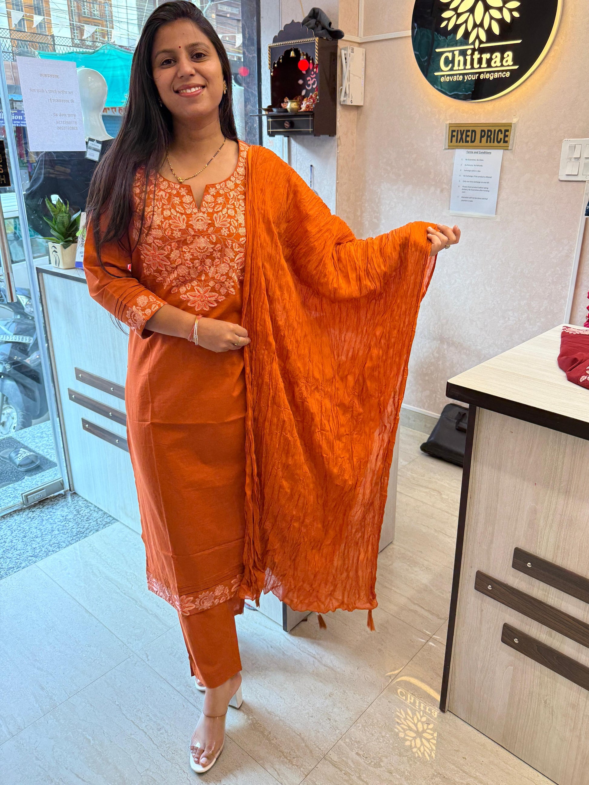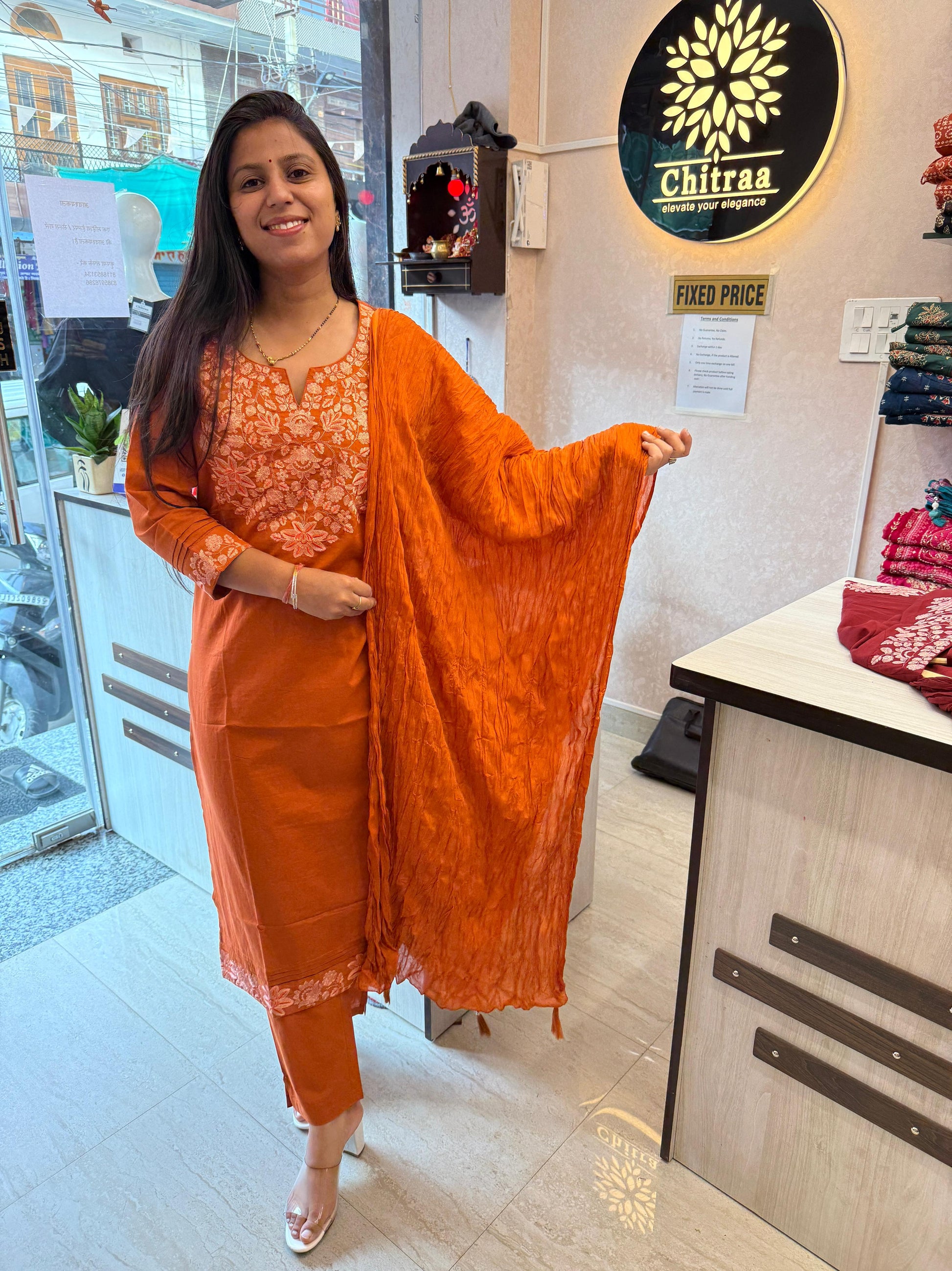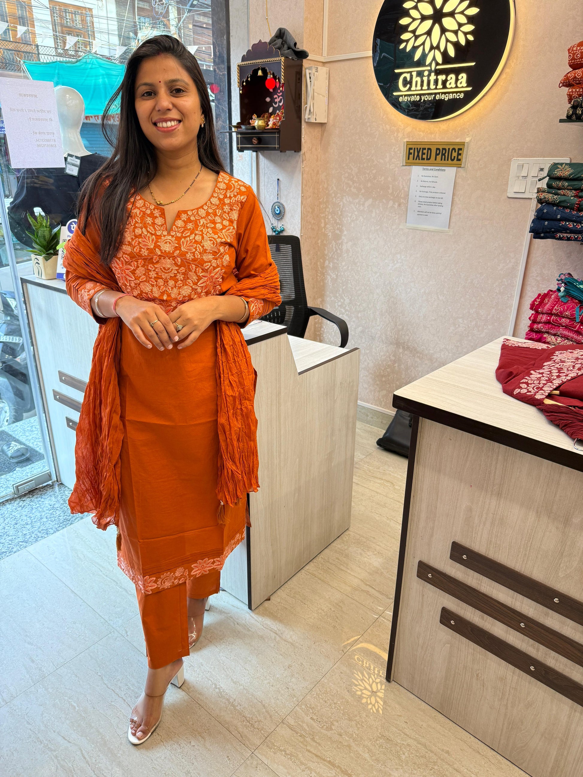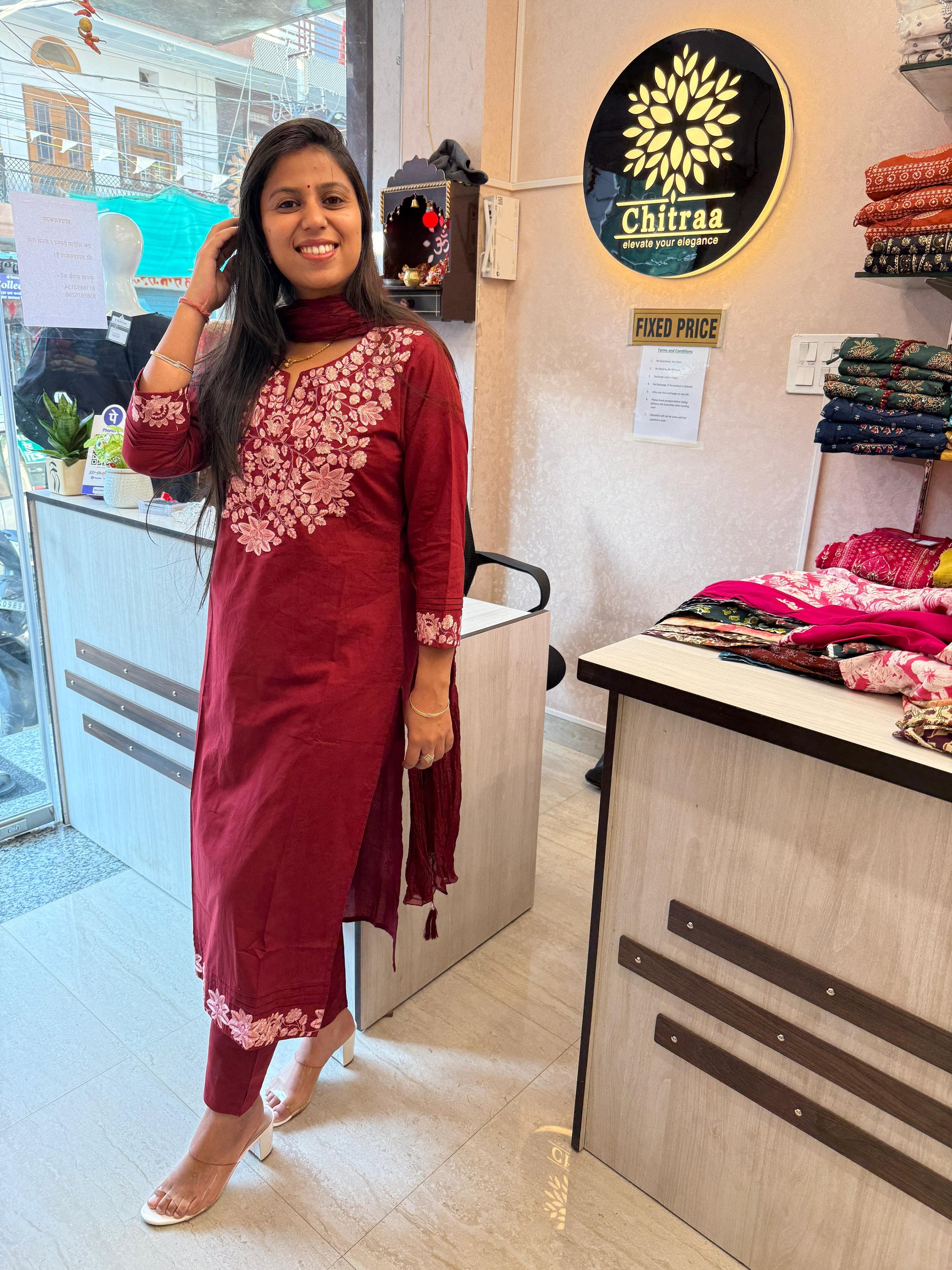 Tamanna is not just a suit set — it’s a palette of moods stitched in pure cotton. With embroidered detailing on the neckline and sleeve line, it feels like heritage simplified for today. Wear the rust cotton suit set for festive mornings, the maroon cotton suit with dupatta for evening gatherings — your mood decides.