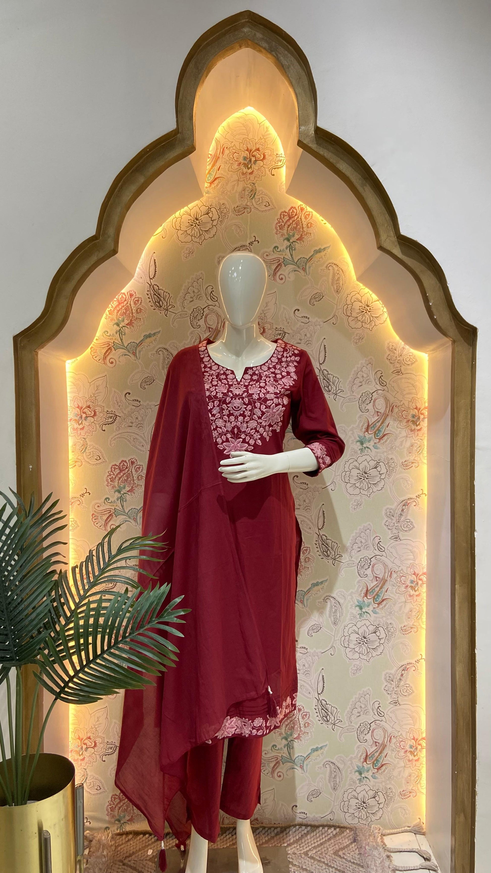 Tamanna – Rust & Maroon Cotton Suit Set with Embroidered Neck & Sleeves | Festive Ethnic Wear for Women