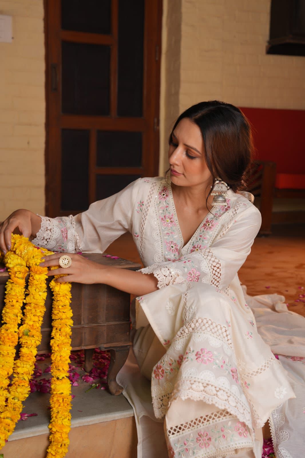 There’s elegance in simplicity, and Tarannum is its truest reflection. Crafted in airy mul chanderi, this white suit is adorned with embroidery along the neckline and bell sleeves, softened with delicate lace detailing. The embroidered dupatta adds just the right touch of festivity. Whether it’s for a puja, celebration, or serene get-together — this is grace in every fold.