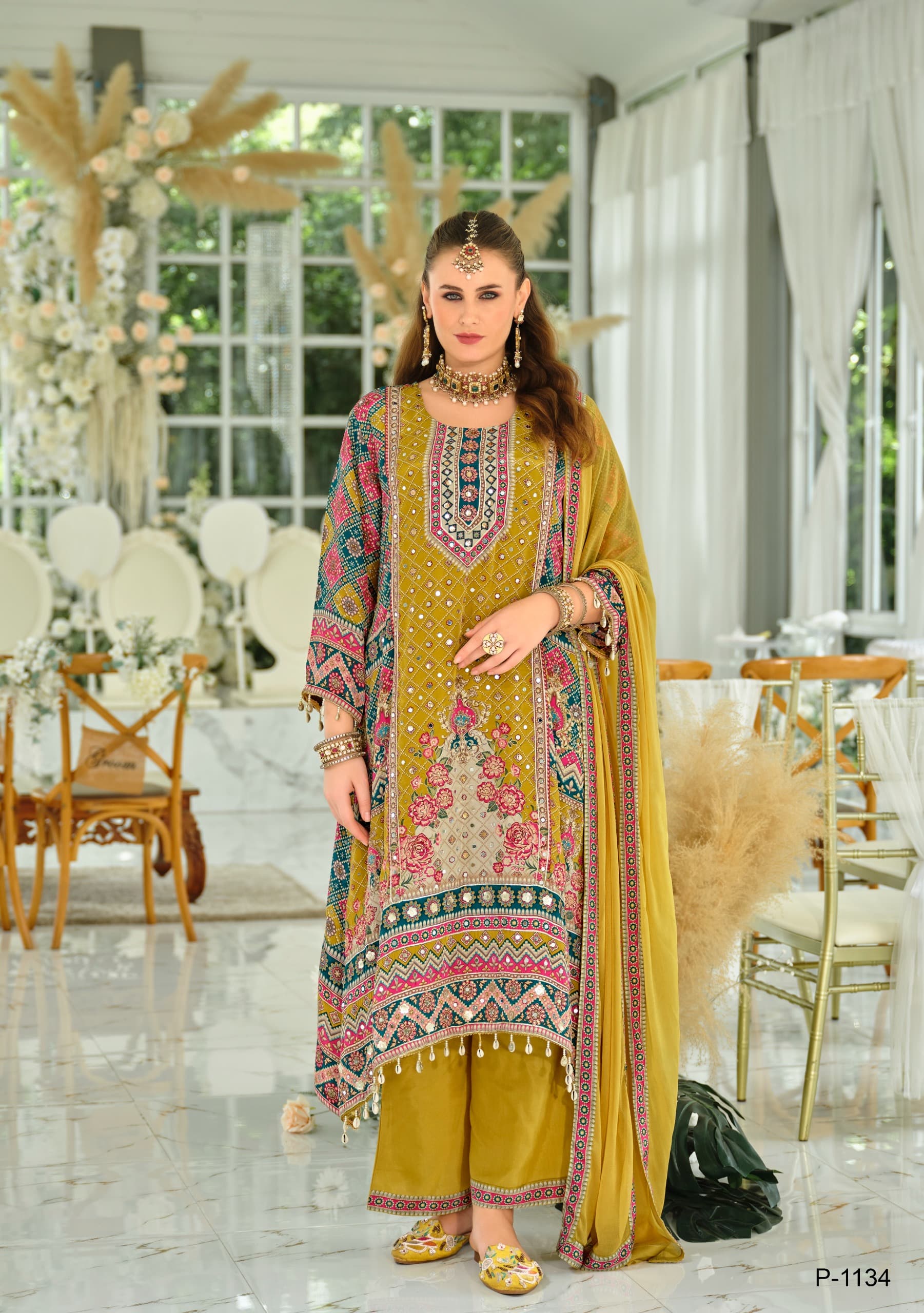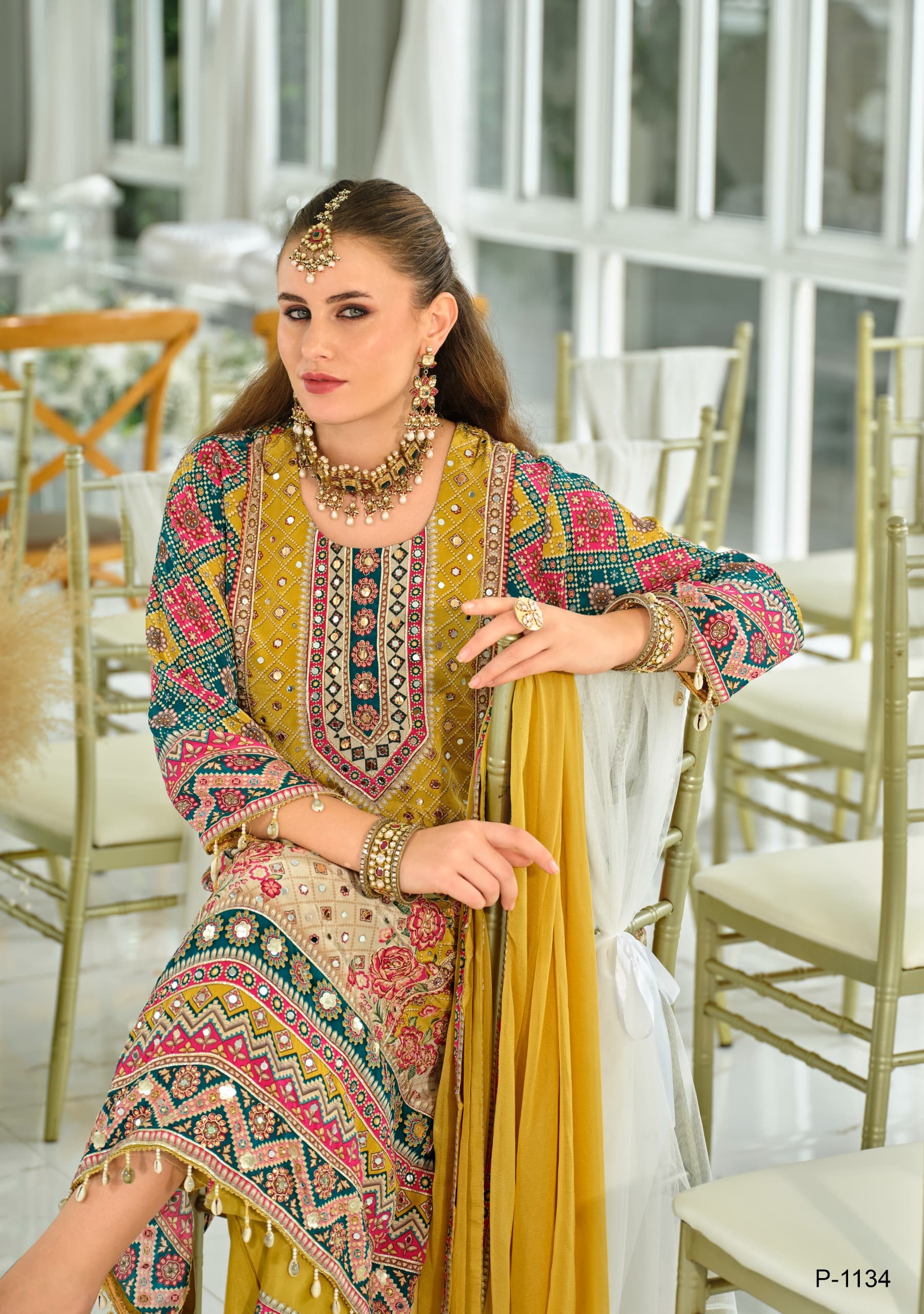 Step into festive radiance with Zarnish, a premium crepe mustard suit set for women that speaks the language of elegance and celebration. The kurta is adorned with intricate multi-color patterns and traditional detailing, balanced with a coordinated mustard dupatta and wide-legged pants for a refined silhouette.