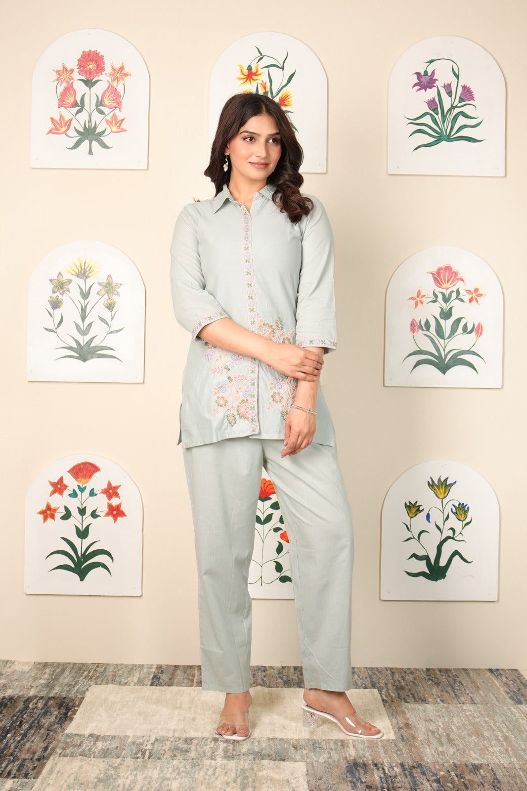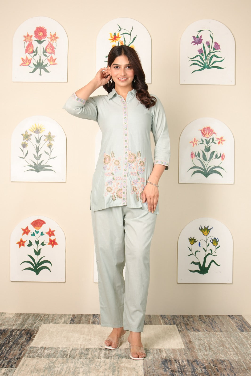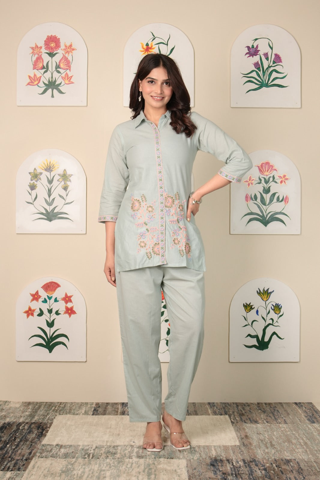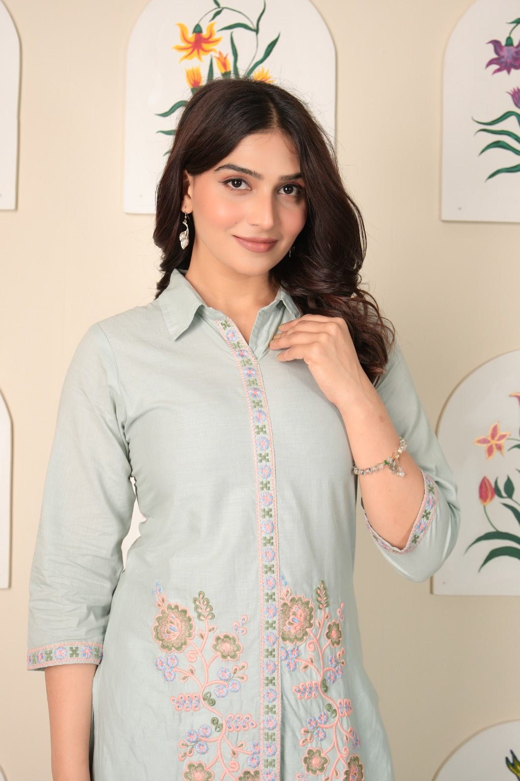 Dastak is a mint green pure cotton embroidered co-ord set that captures quiet elegance. The kurta is adorned with pastel-toned embroidery along the front panel and sleeves, balanced with a clean silhouette and straight pants for all-day comfort.