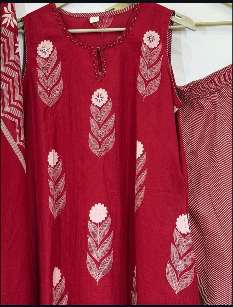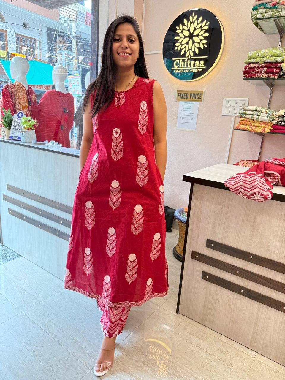 Meet Shafaq, a vibrant red cotton kurta set for women that radiates confidence and comfort. Crafted in a breezy cotton base, this cut-sleeve kurta is paired with wide-legged plazos, making it the perfect blend of modern minimalism and ethnic grace.