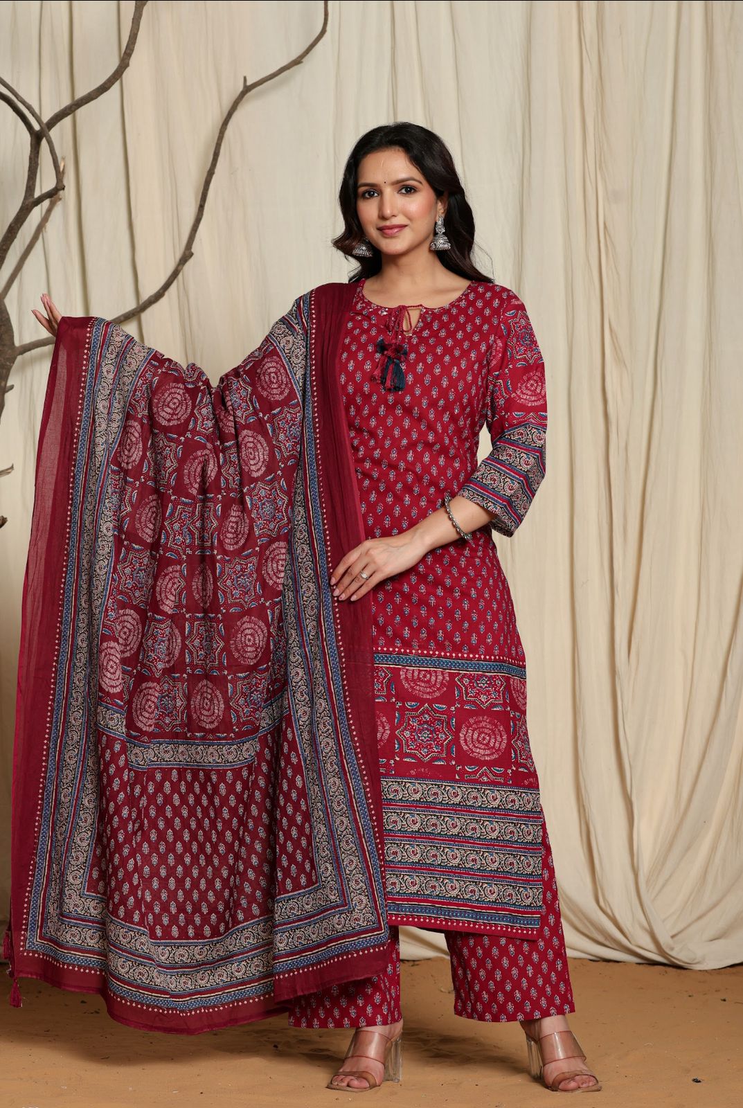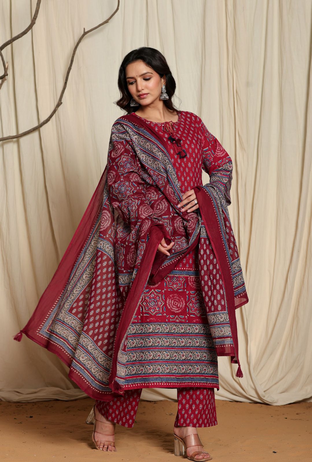 The deep maroon hue — reminiscent of gulnaar blossoms in full bloom — flatters every skin tone and mood. Paired with a coordinated dupatta and clean lines, it’s your go-to pick for festive gatherings, office celebrations, or just those days when you want to feel a little more graceful.