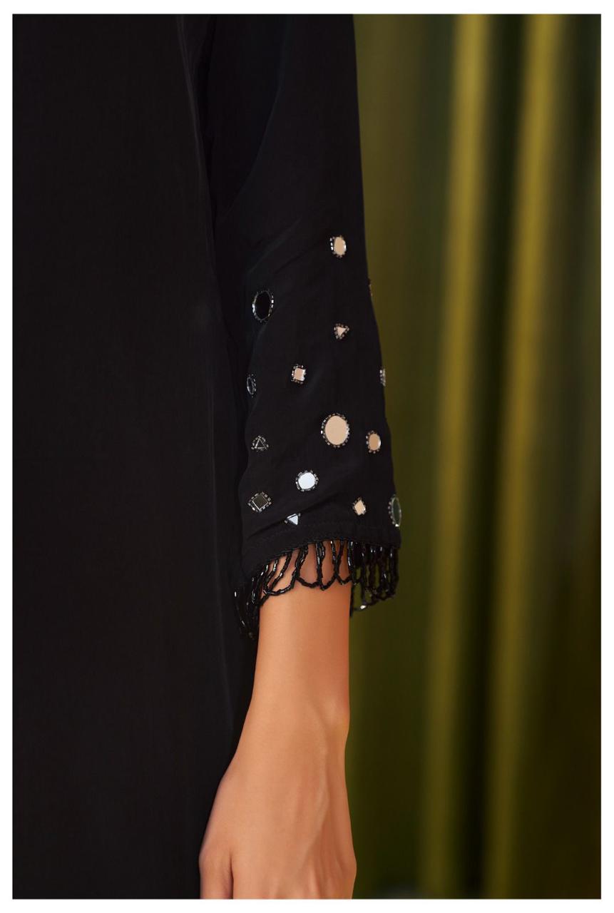 The natural crepe fabric drapes with a fluid fall, offering both comfort and refinement. The mirrors glimmer like constellations under light, elevating the outfit from quiet sophistication to effortless grandeur.