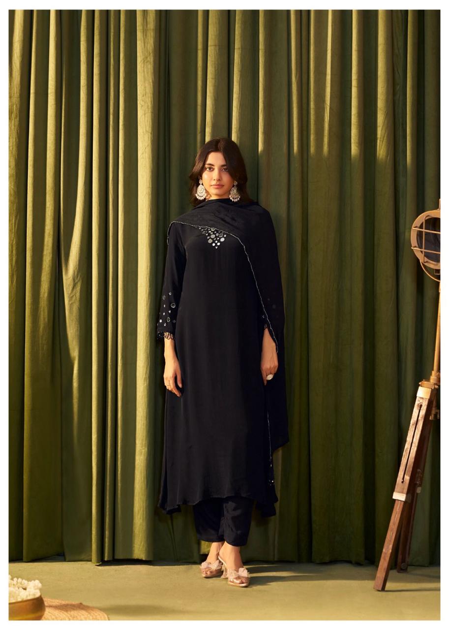 Shab-e-Noor mirrors the poetry of a starlit night - a premium black crepe suit set crafted with subtle real mirror detailing on the neckline and sleeves. Minimal yet luminous, this piece radiates understated luxury, making it the perfect choice for women who believe elegance lies in simplicity.