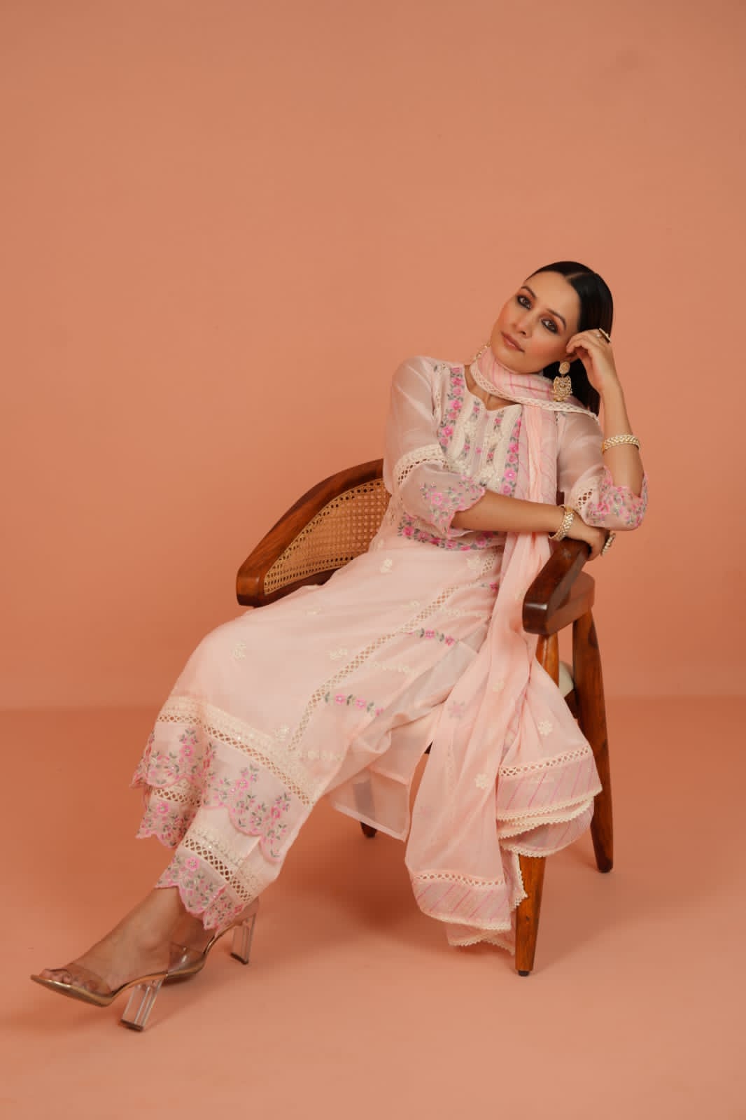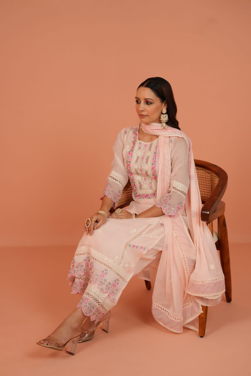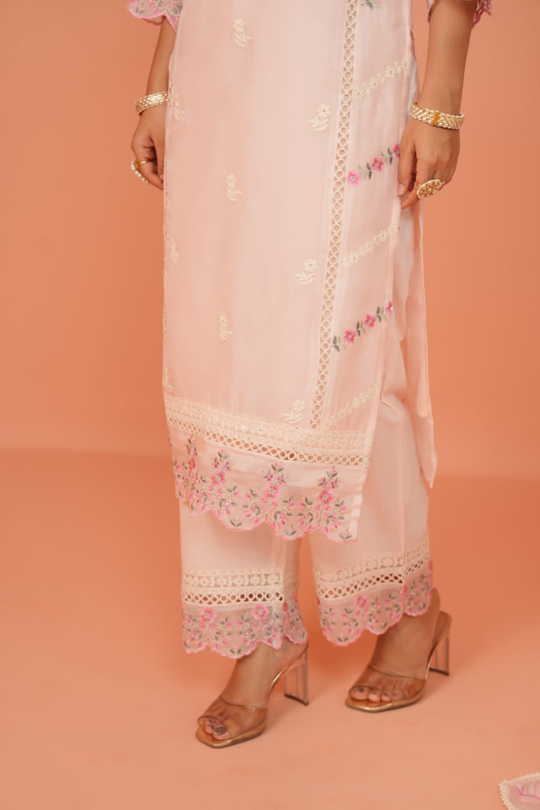 The straight-cut kurta captivates with its very light peach hue, acting as a dreamy canvas for intricate floral embroidery in soft pinks, greens, and creams. This delicate threadwork, subtly enhanced with mirror accents, adorns the elegant round neckline with a V-slit, the stylish three-quarter sleeves, and extends gracefully to the kurta's hem, where delicate lace detailing adds a touch of refined charm. Paired with comfortable matching straight-cut pants and a lightweight organza dupatta featuring complementary embroidery and elegant lace borders, this ensemble creates a cohesive look of unparalleled sophistication.