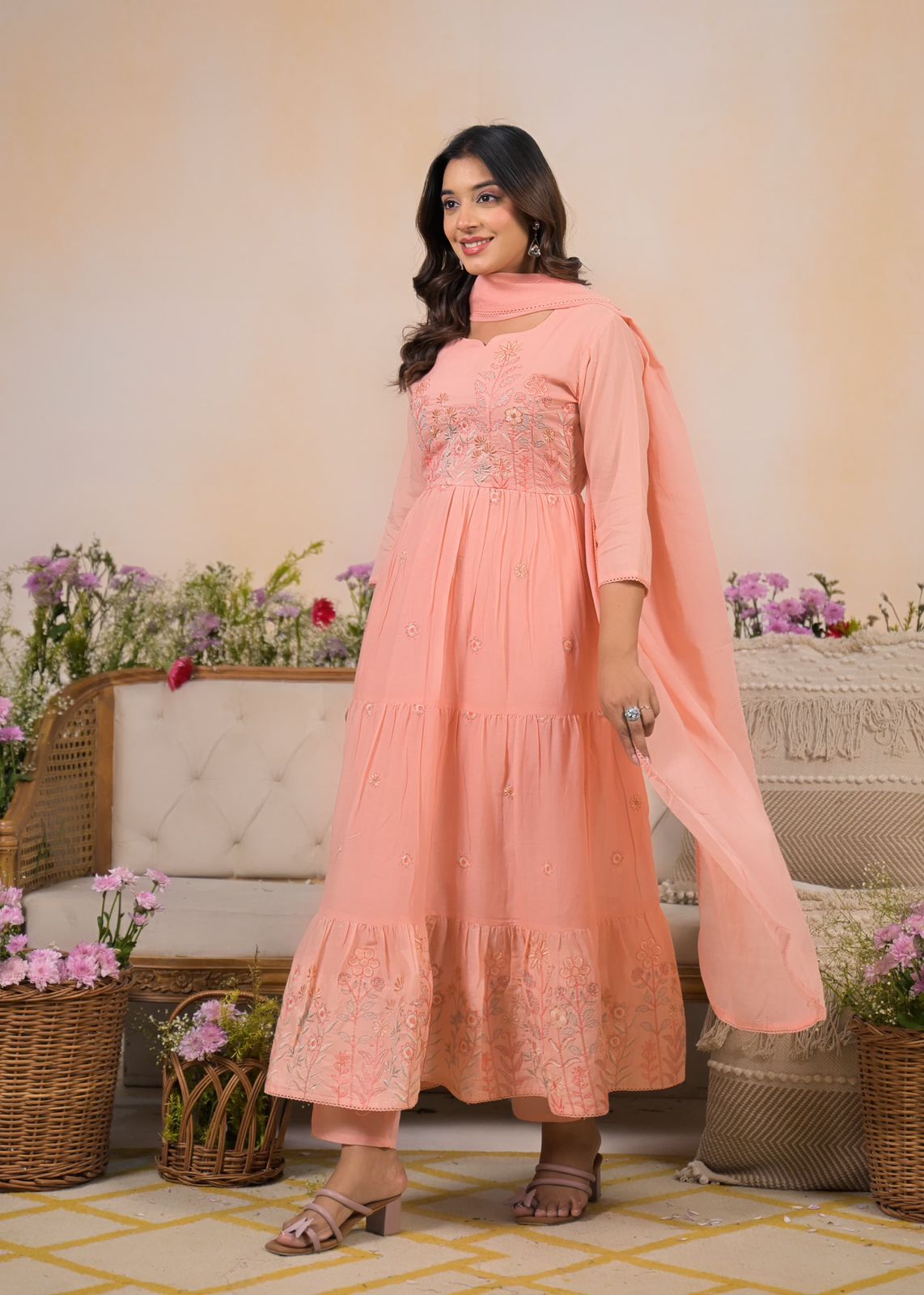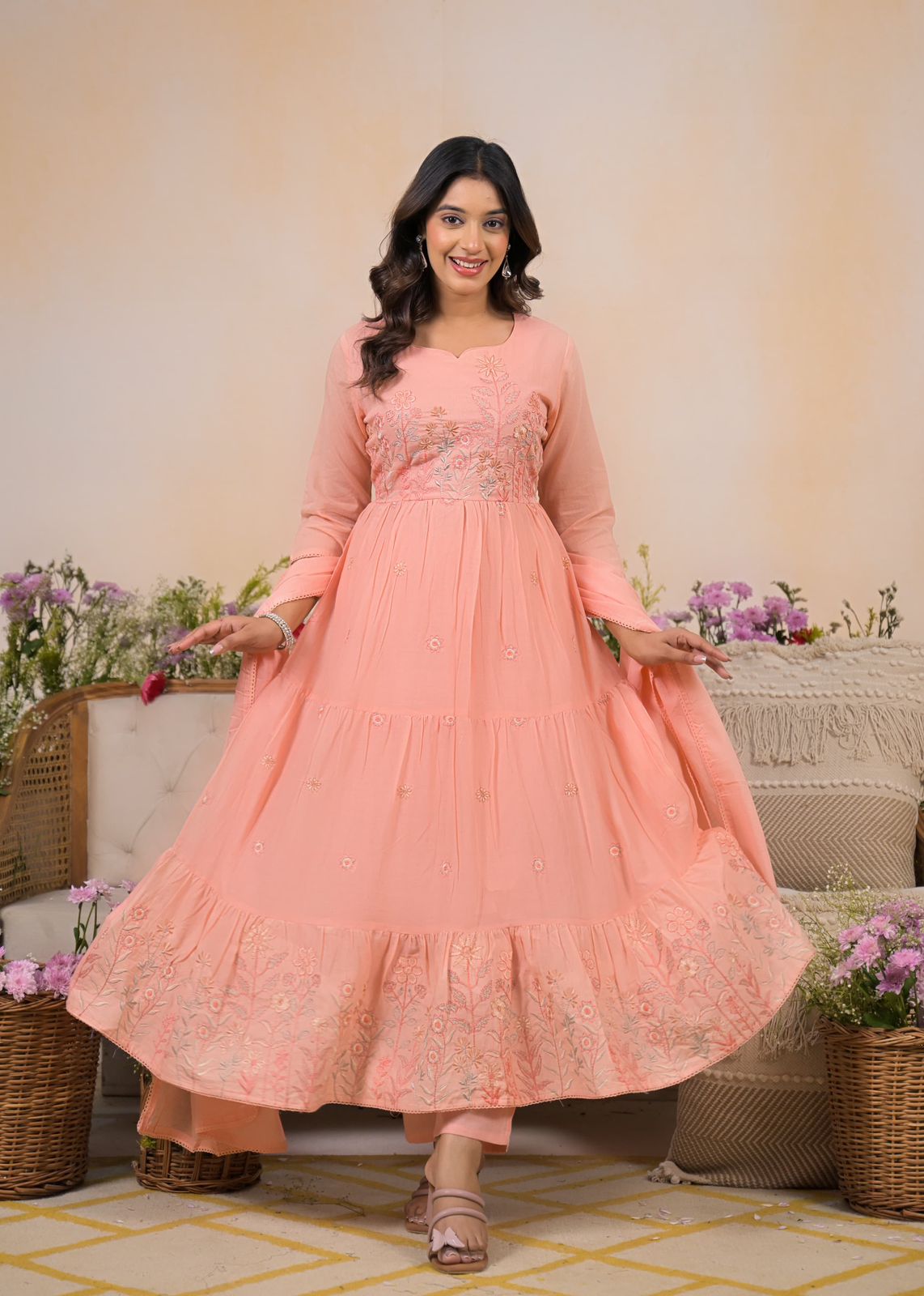 Embrace the essence of blooming beauty with Zoya, a name signifying 'Life' or 'Blossoming,' perfectly reflecting the vibrant and fresh charm of this ensemble. This Romantic Peach Floral Embroidered Cotton Anarkali is a masterpiece of grace, crafted from premium, breathable pure cotton that offers exceptional comfort and a beautifully flowing silhouette.